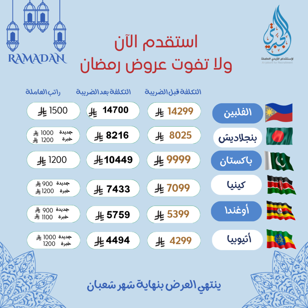 العرض متاح في جميع مناطق المملكة، باستثناء الاستقدام من الفلبين للمنطقة الغربية ومنطقة جازان.
